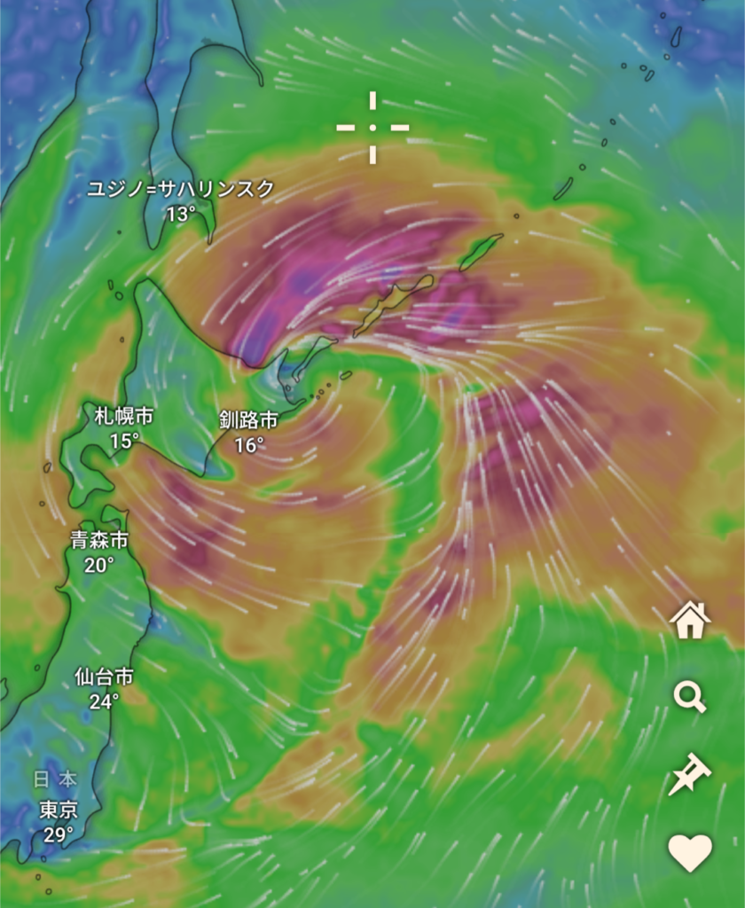 天気はプチ台風のような低気圧が道東付近にあり大雨、爆風です (^^;